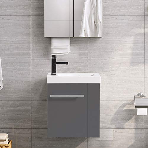 If your bathroom is really tiny, or if you're furnishing a little cloakroom, you will find that you can find extra small basin vanity units too. You can even get ones designed to fit snugly into a little corner. This NRG wall-hung vanity sink unit, shown above from Amazon, measures just 44cm wide, yet there is still room inside for a couple of toilet rolls and some toiletries. The handle can double up as a little towel rail too.